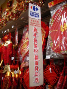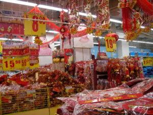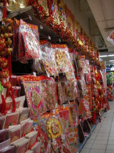スーパーにも春節用の飾りが山盛りに。
