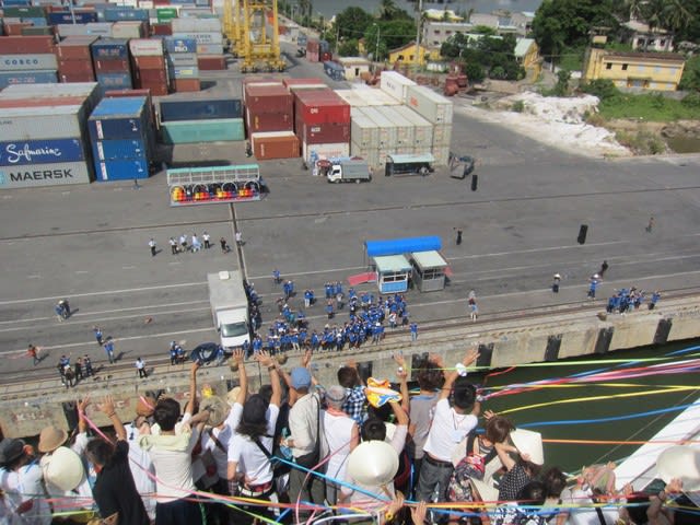 ベトナムの港では、交流ツアーの相手である現地の学生さんがソーラン節を踊って歓迎してくれた。